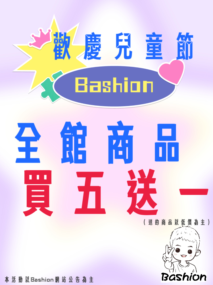 Bashion歡慶兒童節~全館買5送1活動內容如下1.全館商品買5件送1件,送的以購物車最低價商品為主。2.套裝一套算一件,配件一個算一件,送的以購物車最低價商品為主。3.須購買滿6件,才會有送一件的活動優惠活動。4.滿6件送一件,滿12件送2件...以此累積。5.每筆訂單結算一次,不可以合併訂單。6.活動期間為2026/03/29~2026/04/127.全館皆預購商品,請耐心等待,會以最快速度出貨。歡慶兒童節活動Bashion擁有最終修改解釋權